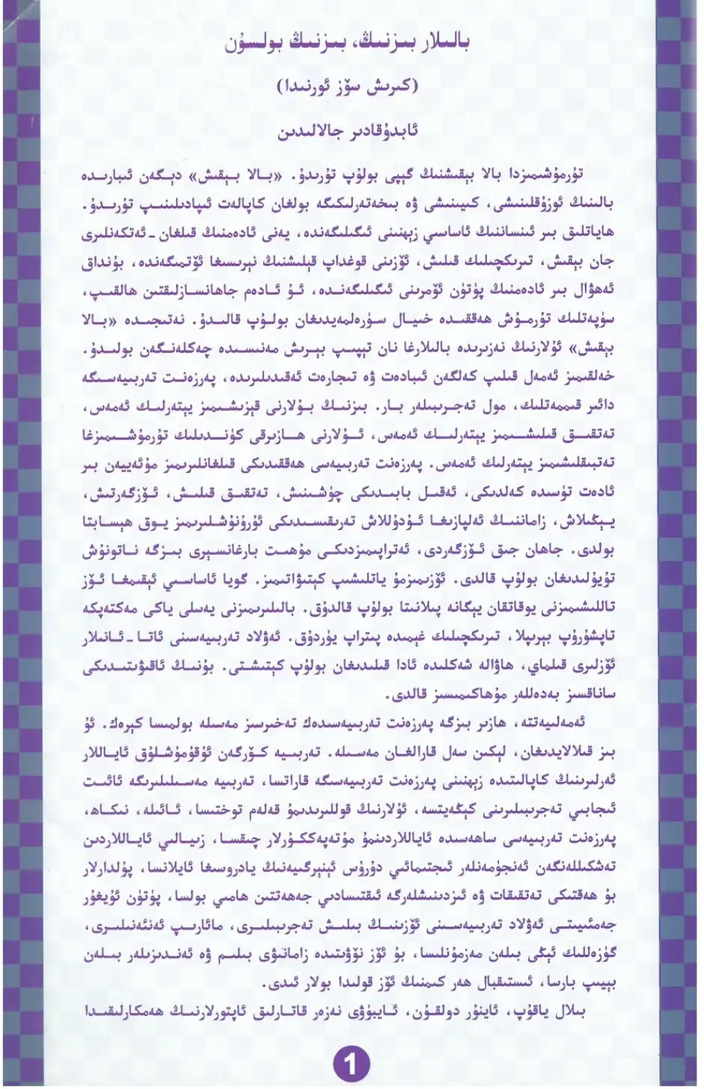 تالانتلىق ئادەملەرنىڭ ئاساسى بالا مەزگىلىدە تۇرغۇزۇلىدۇ. شۇڭا بالىنى بالدۇر تەربىيەلەش كېرەك، قانچە بالدۇر تەربىيەلىسە، ئۈنۈمى شۇنچە روشەن بولىدۇ.